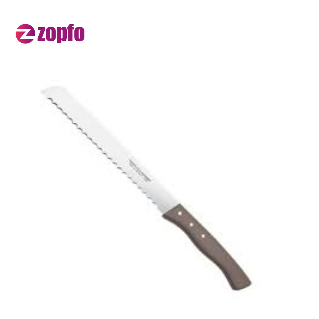 Professional Bread Knife with Plastic & Wooden Handle, featuring a sharp serrated stainless steel blade for clean, effortless slicing of bread and bakery items.